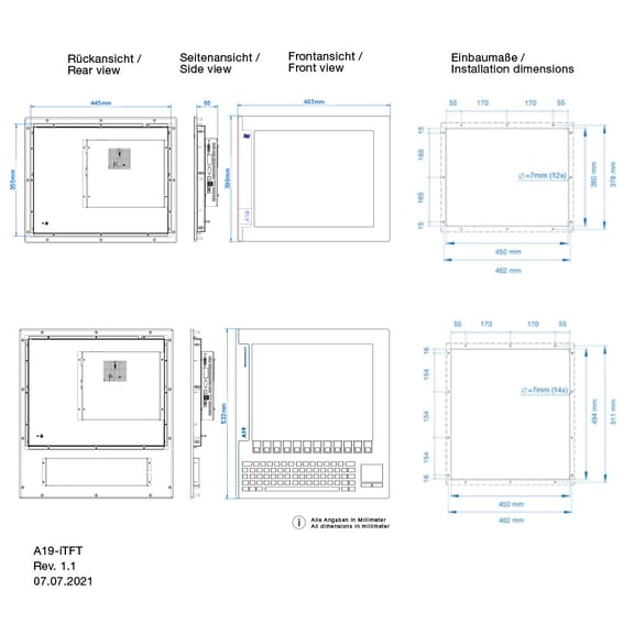 The A19 touch panel is designed for panel mounting and is in accordance of the protection class IP65. Rugged design and low installation depth of chassis, high brigtness and a high reading angle are the advantages by idustrial using. The A19 can be used as TFT display and as panel PC.