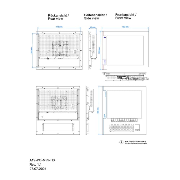 Milled aluminium front, stainless steel on request, front with integrated touchpad and keyboard, 19 "front 9U on request, CPU Upgrade Board Mini-ITX up to Core i7 |