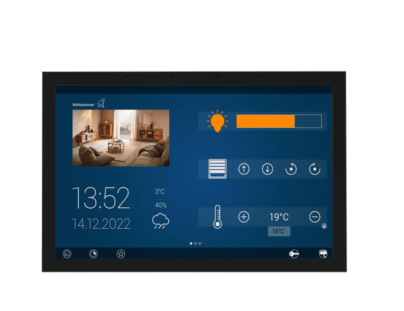 Web panel with a 10-inch display, a borderless, all-black touchscreen. The screen supports adaptive brightness adjustment and offers connections for Ethernet, WLAN, RS485, microphone, and speaker.