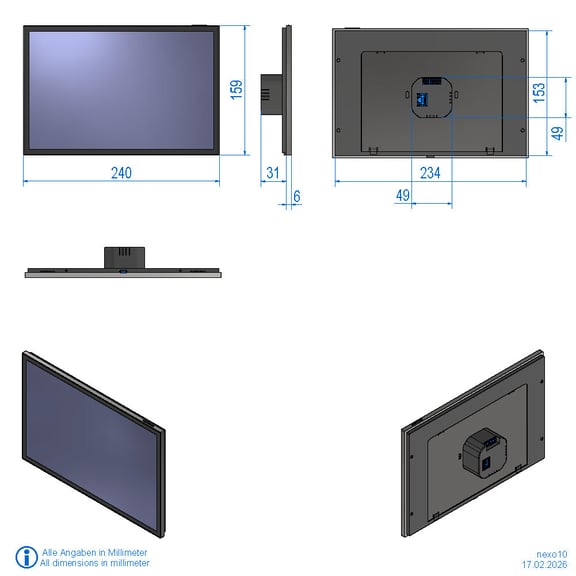 | nexo10 | Webpanel with 10" capacitive touchscreen, CPU Board Rockchip RK3566 quad-core Cortex A55, 2GB RAM, 32GB eMMC storager, brightness and proximity sensor, speaker, microphone, ethernet RJ45 10/100Mbit, 1x USB-C, Phoenix connectors, OE/Yocto Design: black |