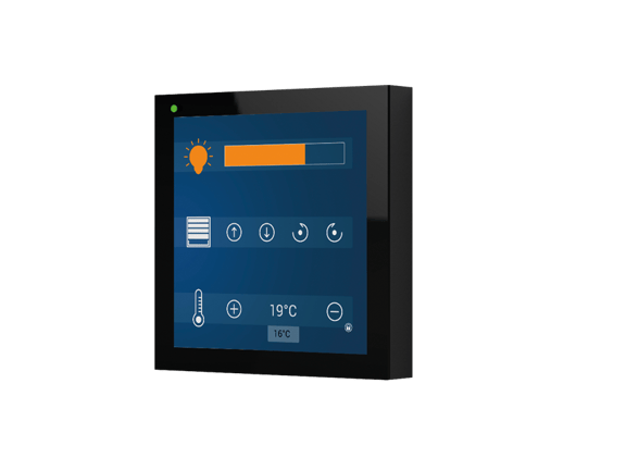The touch surface with a 4-inch diagonal can also be operated without contact using gestures. It can installed in a standard built-in box. Thanks to the integrated temperature sensor, solo saves a separate room thermostat.