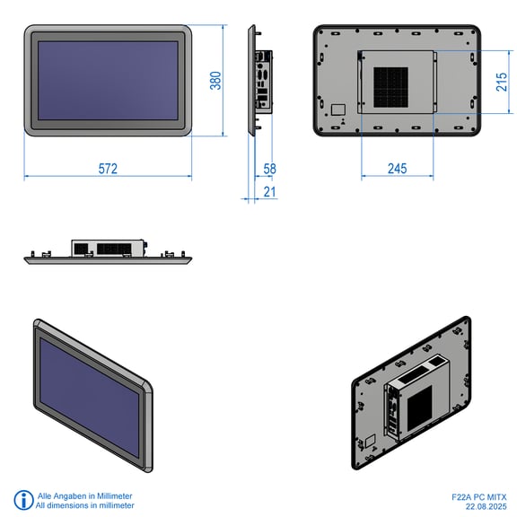 | F22A-PC | Panel-PC, 22" Touch, Board 3.5“ SBC, Intel® Celeron® J6412 CPU (4x 2-2.6 GHz), lüfterlos, Intel UHD Grafik, 8GB RAM, 128GB SSD, 2x HDMI, 2x RJ45 LAN, 4x USB3.2 (Gen1) Optional: Board 3.5" SBC, lüfterlos, Intel® Core™ i5-1135G7 CPU /Board Mini-ITX (mit Lüfter) |