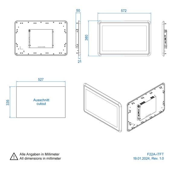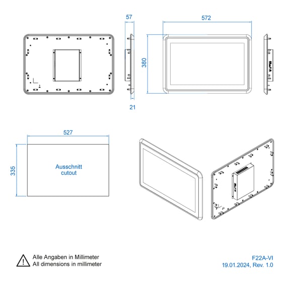 Das Touchpanel F22A ist ein robustes Einbaugerät zur Montage in einem Steuerpult oder in einer Schalttafel. Das Display mit kapazitivem Glastouch bietet eine große Darstellungsfläche für Ihre Visualisierung, die für Sie eine bessere Lesbarkeit und einfachere Touchbedienung bedeutet. Als Varianten stehen PC-basierende Systeme, mit OE/Yocto (Linux) oder reine Displays zur Verfügung.