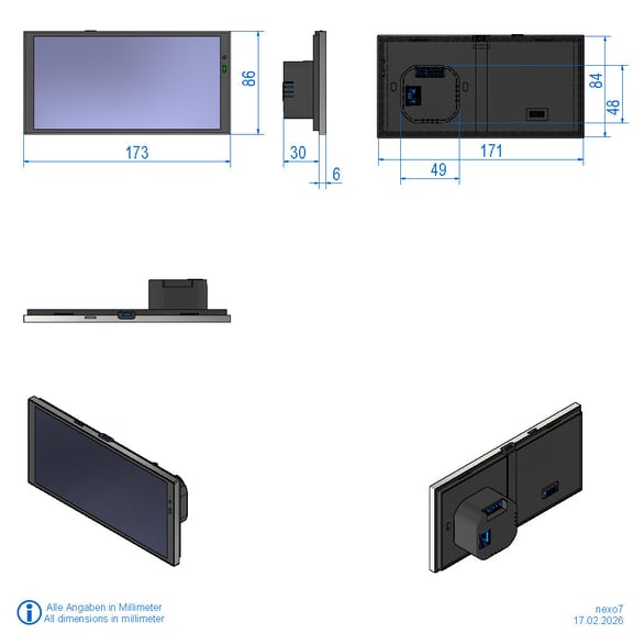 nexo7 Webpanel mit 7" kapazitiver Touch, CPU Board Rockchip RK3566 quad-core Cortex A55, 2GB RAM, 32GB eMMC Speicher, Helligkeits- und Näherungssensor, Lautsprecher, Mikrofon, Ethernet RJ45 10/100Mbit, 1x USB-C, Phoenix-Stecker, OE/Yocto