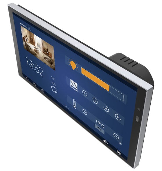 Webpanel mit einem 7-Zoll-Display, einem randlosen, komplett schwarzen Touchscreen. Der Bildschirm unterstützt adaptive Helligkeitsanpassung und bietet Anschlüsse für Ethernet, WLAN, RS485, Mikrofon und Lautsprecher.